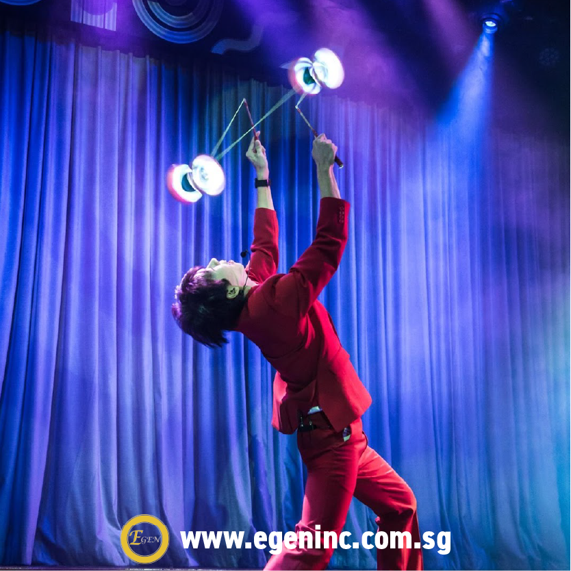 Willis’ skills include balls and clubs juggling, crystal ball manipulation, diabolo, yo-yo, poi spinning, hoops and rings manipulation. He can customise his shows from a silent variety act to comedy juggling show to cater to the client’s needs. His family-friendly shows are suitable for all events!